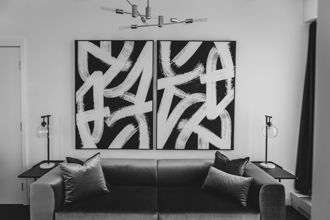 There were some layout challenges in the space with it being super small and having a huge structural post in the middle. The building had a suggested floor plan which didn’t work, it cut-off the space making it an inefficient layout. There was a TV floor outlet in the middle of the room, so we had to reroute it through a bedroom and mounted the TV on the wall for an optimal space plan.