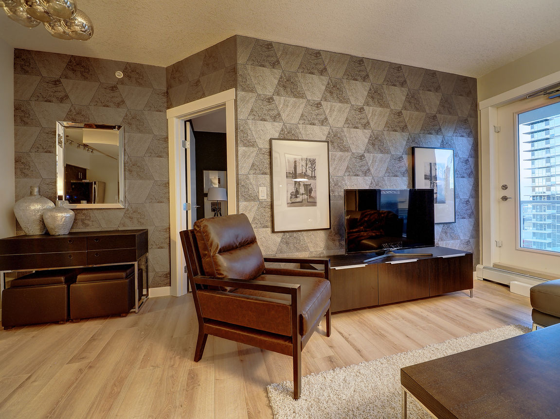 This Fox Tower apartment in Edmonton was original lived in by client, but he was planning to move and to use it as rental unit. He wanted it to look it’s very best, so that’s were FLIS Interior Design came in, to revamp it for future viewings. The apartment features fabulous grey/silver geometric wallpaper in the foyer and on one feature wall in the living room to give it a real sense of drama. The apartment has a grey and brown furniture colour theme throughout to achieve a masculine look and the master bedroom features a combination of navy blues. We added warm brown fur accents in the bedroom and living rooms for a sexy, comfortable feel.